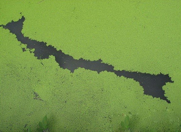 的水潭中漂浮的浮萍许多时候具有与草地接近的外观特征,但多数的动物通过本能便能判断其与真实草地的差别。这里存